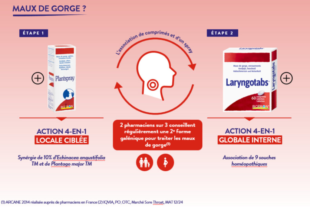 Afin de cibler au mieux les maux de gorge et les aphtes, les Laboratoires Boiron ont mis au point une formule originale et efficace, à base de deux actifs d’origine végétale.